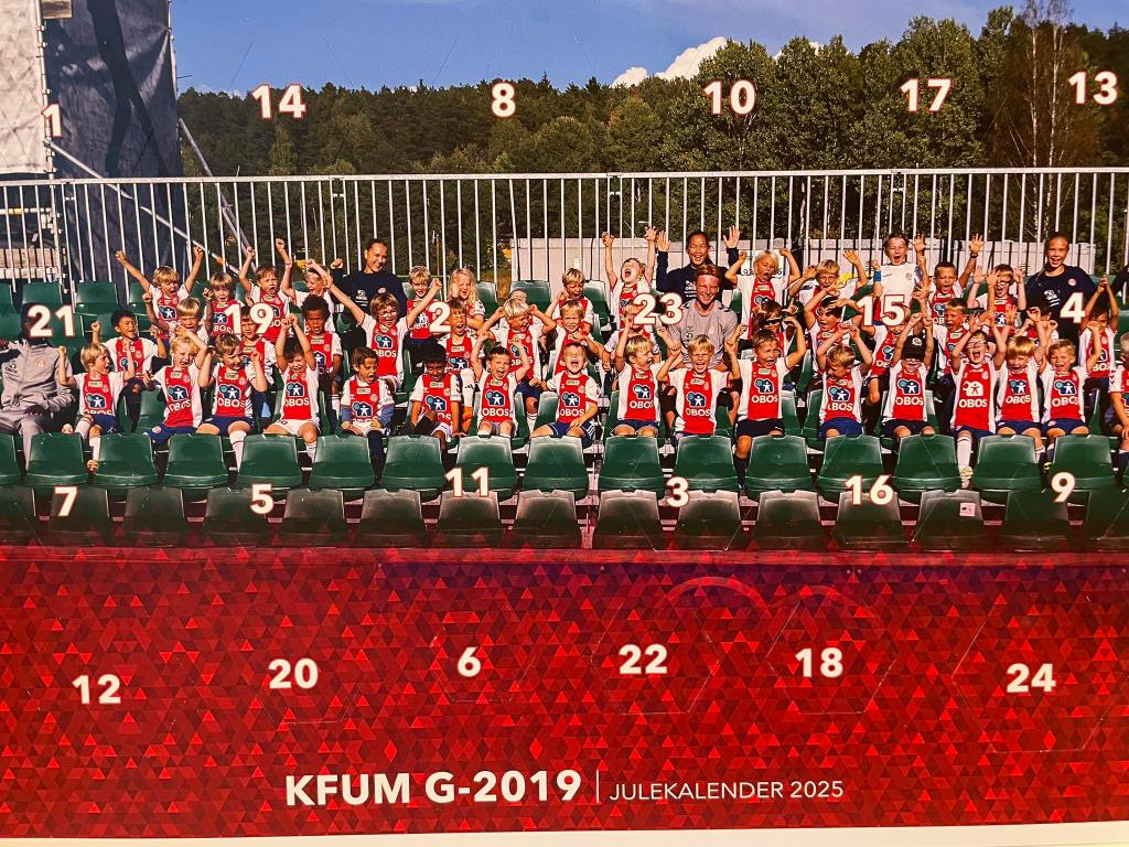 VÀ CÁC CẦU THỦ NHÍ OSLO – GIÁNG SINH 2025 Các cầu thủ nhí (Sinh năm 2019) đã được in lên lịch cào Giáng Sinh 2025. Mỗi tấm lịch cào được bán giá 200 kr, tại Oslo.